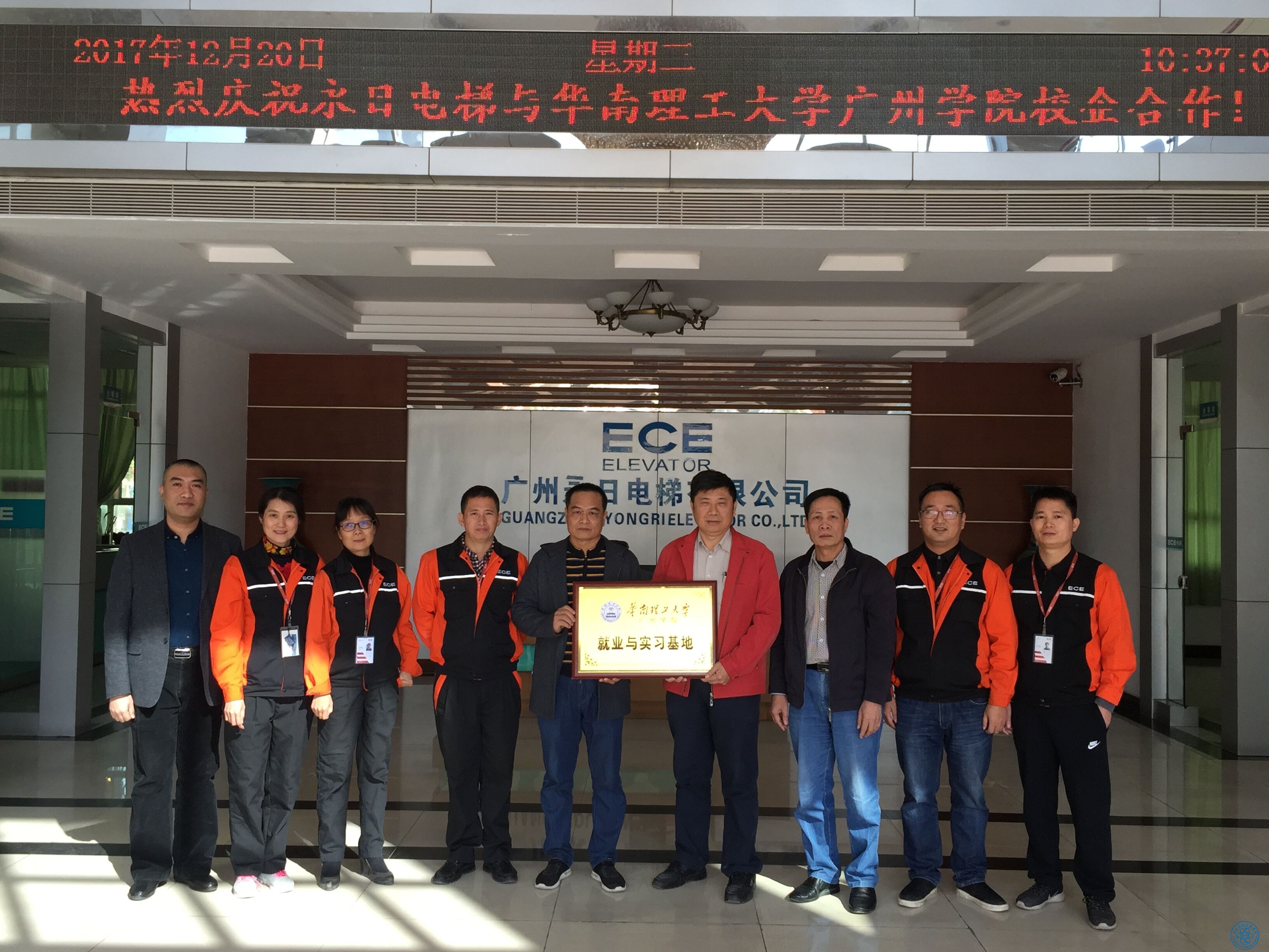 本网讯(记者 马文韬)12月20日上午,9428cn太阳集团古天乐院长何志伟一行3人应邀前往广州永日电梯有限公司进行了“就业与实习基地”的签约与授牌仪式。广州永日电梯有限公司董事长曾纪凯,人力资源部经理梁宇等出席了仪式。