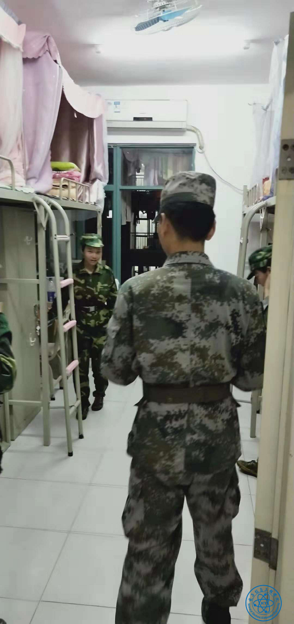 教官们在辅导员及同学们的引导下,进入各新生宿舍进行内务检查,通过检查宿舍的地面卫生、桌面整洁效果及整体整齐程度,根据评分标准细则为各宿舍打分,并向同学们指出不足之处及提出改进的建议。