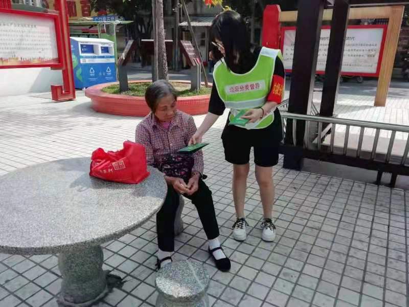 陈镁思、黄子羡等学生党员于3月26日积极向村民派发垃圾分类宣传单,指明垃圾分类投放点位置及移动垃圾分类投放点具体投放时间;在垃圾投放点站岗,协助村民正确实行垃圾分类。