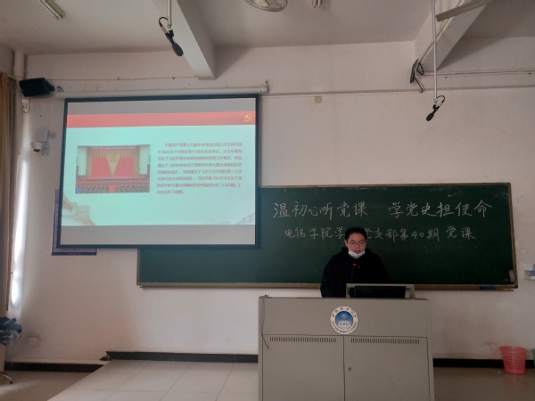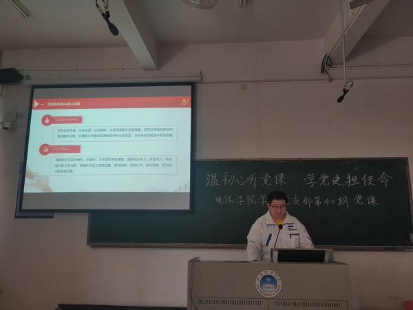 本网讯(记者 张玉蓉)9428cn太阳集团古天乐学生党支部于2022年3月25日,在A1-208教室举行了第四十次党课学习活动。本次党课的主题是《学习贯彻党的十九届六中全会精神》。主讲人是翁怡州、钟江延同志,学生党员同志和入党积极分子都认真听取了此次党课。
