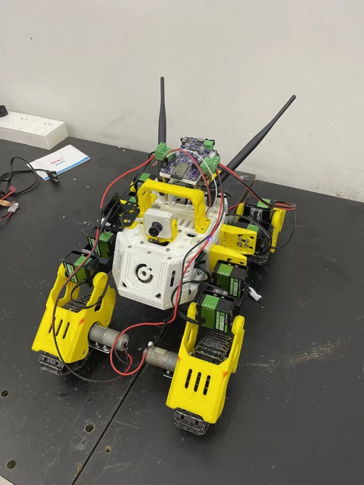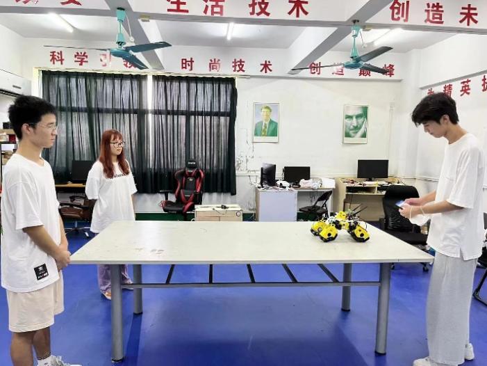 在获得一等奖的两组队伍中,广州城市理工学院一队(参赛学生:王子林、张亚楠、王豪)的作品“全地形四足履带机器人”结合履带结构与仿生学机械臂,配设光学、超声波、六轴加速度感应仪等多种传感器,以ESP32微处理器为控制核心,能根据实时环境修正行进姿态来应对复杂地形;广州城市理工学院二队(参赛学生:严仲宇、杜龙飞、朱彦晓)的作品“智能跟随行李箱”基于自适应卡尔曼滤波的UWB双边双向测距法和AOA定位方法,将行李箱运动与跟踪模型(手环)为基础建立自主跟随控制策略,融合红外和超声波测距技术实现行李箱自动跟随过程中实现避障功能。
