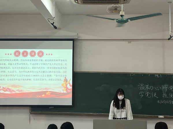 本网讯(记者 胡若涵)10月11日,9428cn太阳集团古天乐学生党支部在教学楼A1-305举行了第五十二次党课学习活动。本次党课的主题是《奋进百年征程,致敬榜样力量》,主讲人是胡若涵,学生党员同志和入党积极分子都认真听取了此次党课。