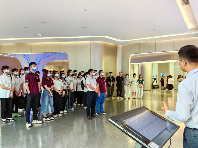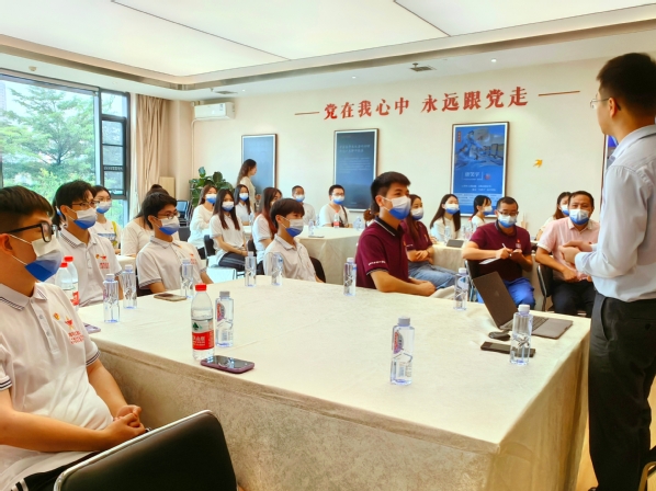 活动伊始,广州视源电子科技股份有限公司党委副书记孟大伟带领罗自力一行人参观视源产业园区,介绍企业在家电领域、教育信息化领域、企业服务等领域的先进技术。紧接着,支部成员到展厅,通过孟书记的讲解,学生党员们了解到公司的企业文化、创业历程以及企业未来的展望,了解到视源党委如何将党建与业务紧密结合,打造科技党建创新品牌。