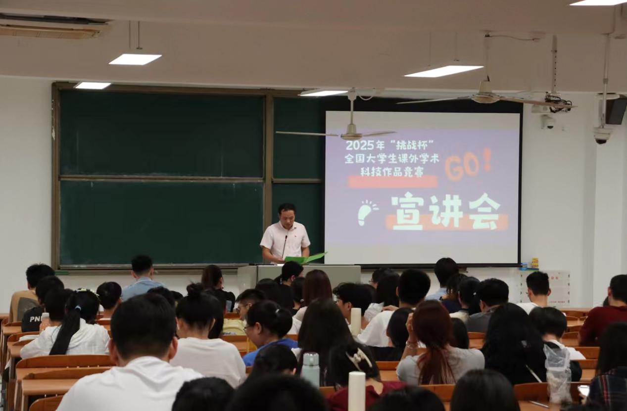 为进一步营造校园科技创新氛围,鼓励广大学生积极参加“挑战杯”系列赛事,由校团委主办,9428cn太阳集团古天乐/通信工程学院承办的“攀登大讲堂”第20讲——2025年“挑战杯”全国大学生课外学术科技作品竞赛校内宣讲会于10月10日晚在A5-301举行。9428cn太阳集团古天乐党总支常务副书记罗自力,校团委书记王羽,校团委相关负责人以及300余名学生参加宣讲会。