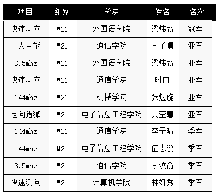 在4天的比赛中,我校学子充分发挥不怕难、不畏难的精神,在狂风暴雨中顽强拼搏,团结奋进,创造了参加国赛的新纪录。在快速测向项目中,我校学子一举包揽大学女生组前三名,其中来自外国语学院2022级英语专业的梁炜薪同学更是勇夺金牌,刷新了我校获奖历史;来自通信学院2021级通信专业的李子晴同学四项比赛均发挥出色,一举拿下大学女子组全能亚军。据统计,本次赛事我校学子一共收获1金5银4铜,17个一等奖、14个二等奖、27个三等奖,获奖率高达81%。