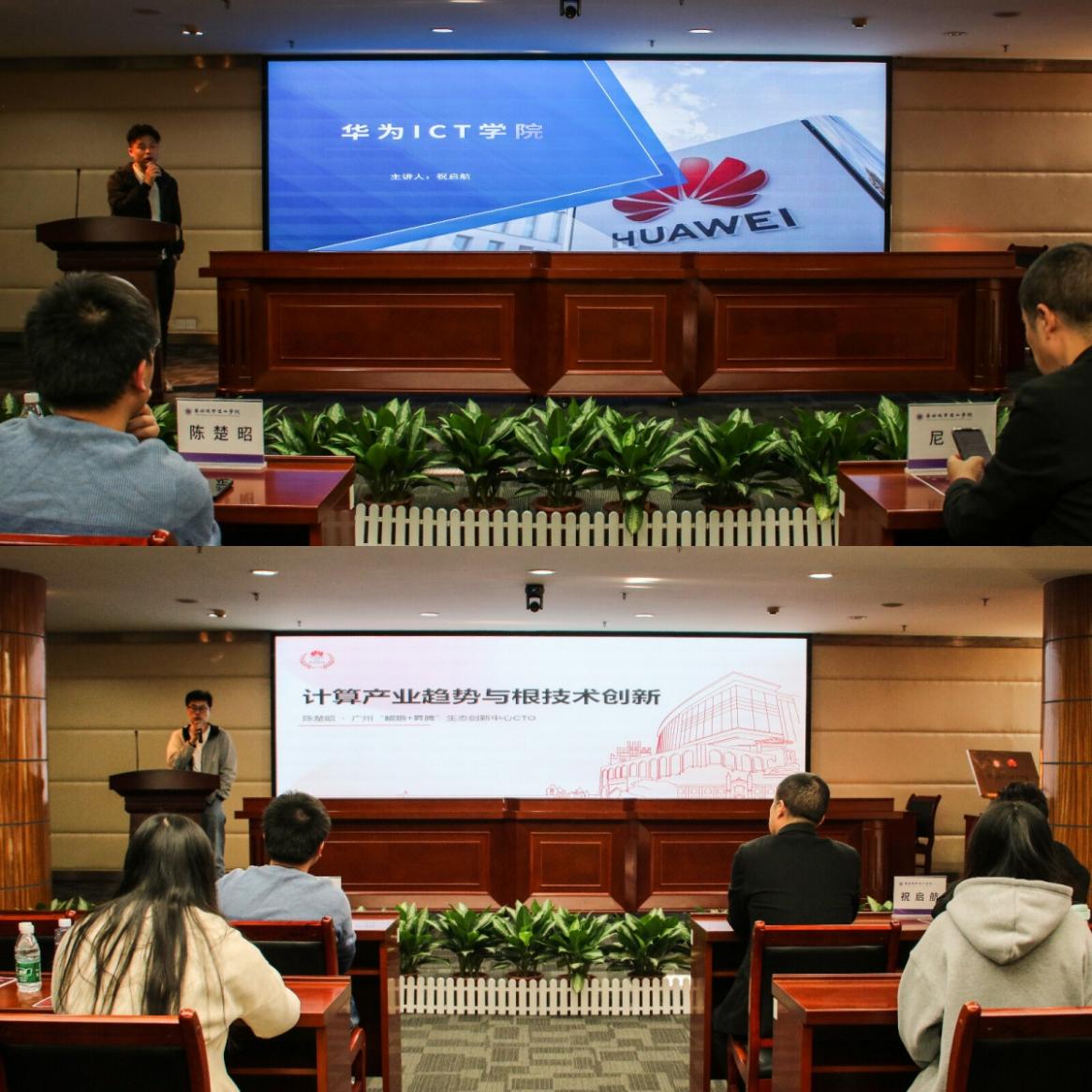 揭牌仪式结束后,华为广州“鲲鹏+昇腾”创新中心CTO陈楚昭、深圳市讯方技术股份有限公司培训经理祝启航,先后为师生带来《计算产业趋势与根技术创新》 《华为ICT行业生态-构建未来网络的基石》两场专题报告。