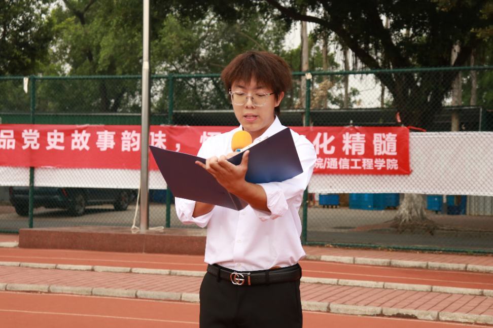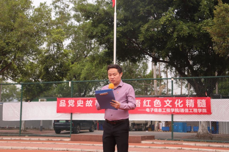 2023级电子信息工程3班学生代表娄宏宇进行发言,他说道,从红船建党到长征的艰难卓绝;从广州起义烈士的英勇无畏,到当下大湾区的蓬勃发展,红色精神的传承需要我们一代代人的努力。号召全体学院学子扎根岭南,借专业力量书写新时代青年人的担当。