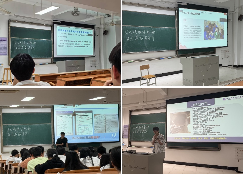 2024届通信工程学院毕业生许广祎以“青春赴西部,奉献正当时”为题,讲述了自己参与西部计划、服务新疆基层的见闻与感悟。她解读了西部计划的招募流程、政策支持及基层工作日常,并展示边疆地区的自然风貌。她希望同学们跳出舒适圈,到祖国最需要的地方书写人生篇章。随后,2023届外国语学院毕业生李晓敏结合广东省“三支一扶”项目,从政策解读到实践案例,分析了基层服务对个人成长与职业发展的双向赋能。她提到,“三支一扶不仅是助力乡村振兴的重要平台,而且是锻炼与机遇并存的选择”。