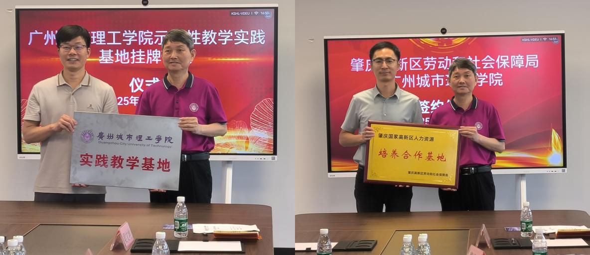 最后,双方举行了双向挂牌仪式,分别是学院在广东省新一代信息技术产业人才公共实训中心挂牌“实践教学基地”以及肇庆高新区劳动和社会保障局在学院挂牌“培养合作基地”。