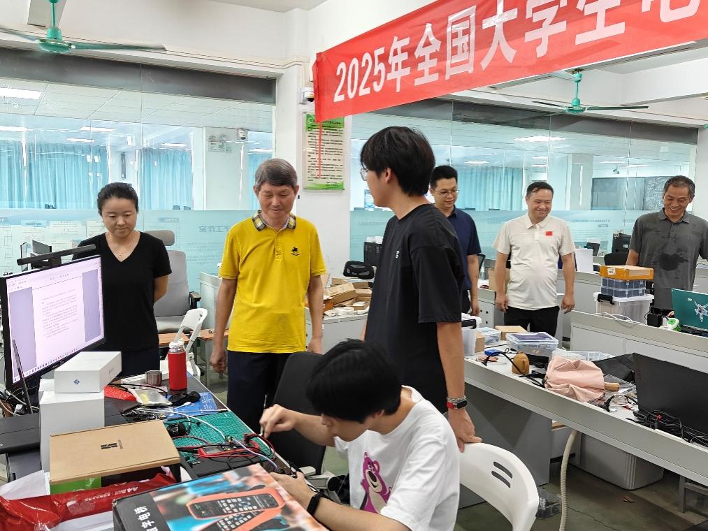 比赛期间学校和学院领导高度重视,组织相关教师对参赛学生进行关怀和鼓励,9428cn太阳集团古天乐/通信工程学院院长姚若河带领学院主要领导连同校团委书记王羽、实验室管理中心主任陈锐鸿关心学生参赛情况,亲临现场指导竞赛相关工作。