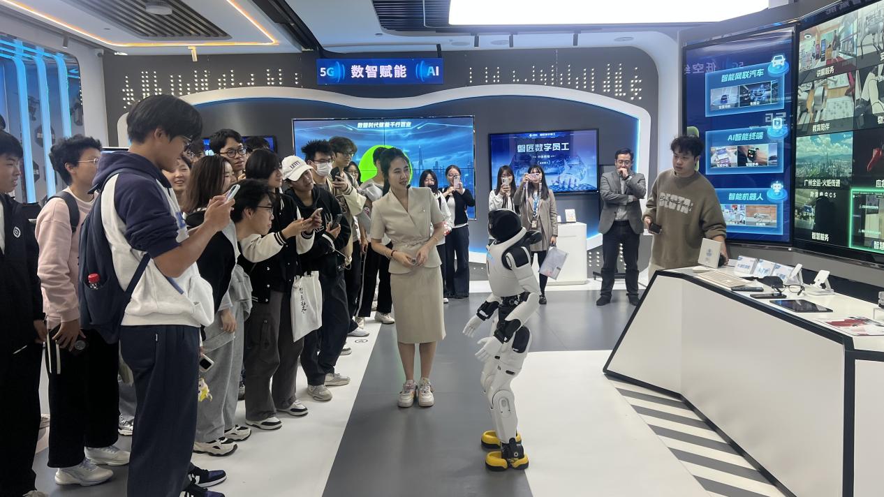 活动伊始,师生们在广州移动工作人员的引导下,步入5G+AI联合创新基地展厅。展厅内涵盖智慧城市、工业互联网、智慧教育、智慧医疗等多个核心应用模块,通过互动沙盘、VR/AR等沉浸式呈现方式,生动还原了5G、人工智能、云计算等技术与千行百业的深度融合场景,直观呈现了数字化转型给社会生产生活带来的革命性变化。同学们围绕技术应用痛点、行业发展趋势等方面提问,与企业技术骨干展开交流,在亲身体验中深化了对专业知识的理解,拓宽了科技视野。