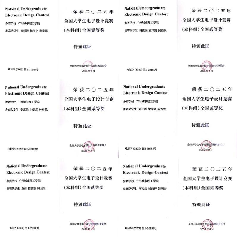 我校学子在2025年全国大学生电子设计竞赛中获得全国一等奖1项,全国二等奖5项,省级一等奖11项,省级二等奖6项,省级三等奖7项。国赛成绩位列为广东省本科组第一,省赛成绩位列广东省并列第一,创我校参赛历史最好成绩。